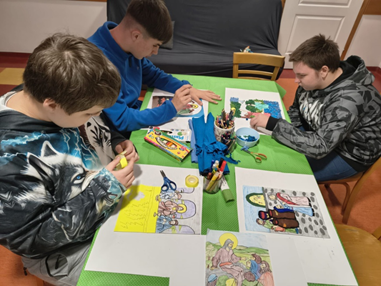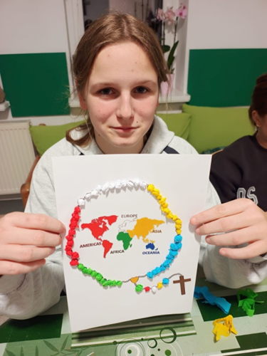 Na zajęciach w ośrodku grupa dziewcząt  w intencji misjonarzy wykonała piękną pracę plastyczną w postaci kolorowego różańca misyjnego. Każdy kolor symbolizuje jeden z pięciu kontynentów. W ten sposób  dziewczęta włączyły się w dzieło misyjne Kościoła, pamiętając o tych, którzy niosą Ewangelię w najdalsze zakątki świata.