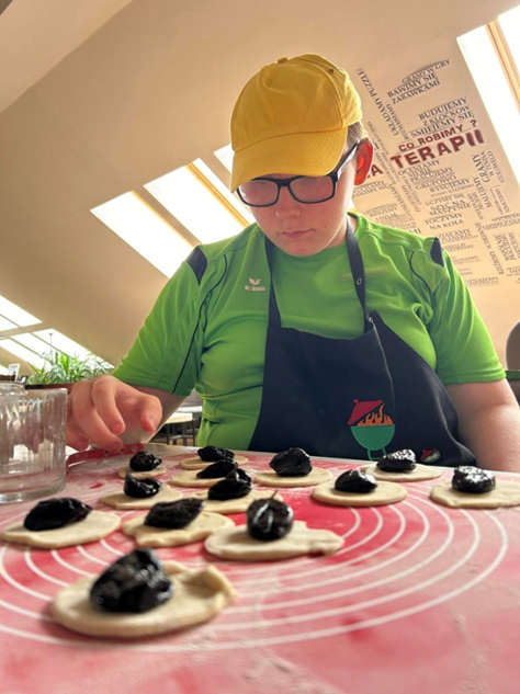 Grupa starszych chłopców uczyła się lepić pierogi rozwijając przy tym samodzielność, współpracę i umiejętności praktyczne.