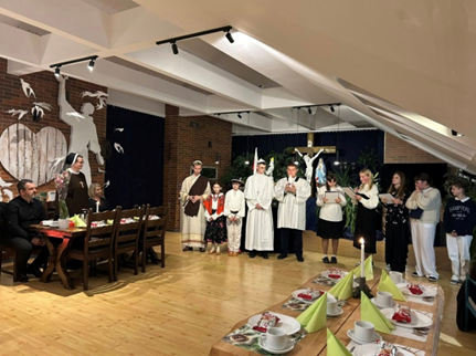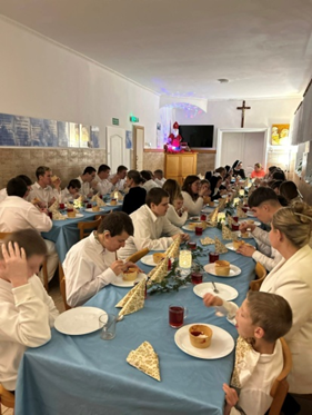 i zaprezentowania danych świętych. Następnie pyszny deser – poczęstunek i po nim rozpoczęła się zabawa taneczna w pięknie udekorowanej „Sali Aniołów”.