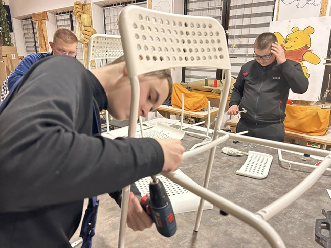 Chłopcy zmontowali regał wraz z drzwiczkami na zamek i szufladami, a także stół i krzesła. Wykazali się dużą dokładnością oraz bardzo dobrą współpracą! Z zaangażowaniem i radością wykonali powierzone zadania, myśląc o swoich rówieśnikach – to właśnie dla Nich powstaje nowa pracownia. Szczególnie widoczna była empatia. I odpowiedzialność za wspólne dobro.